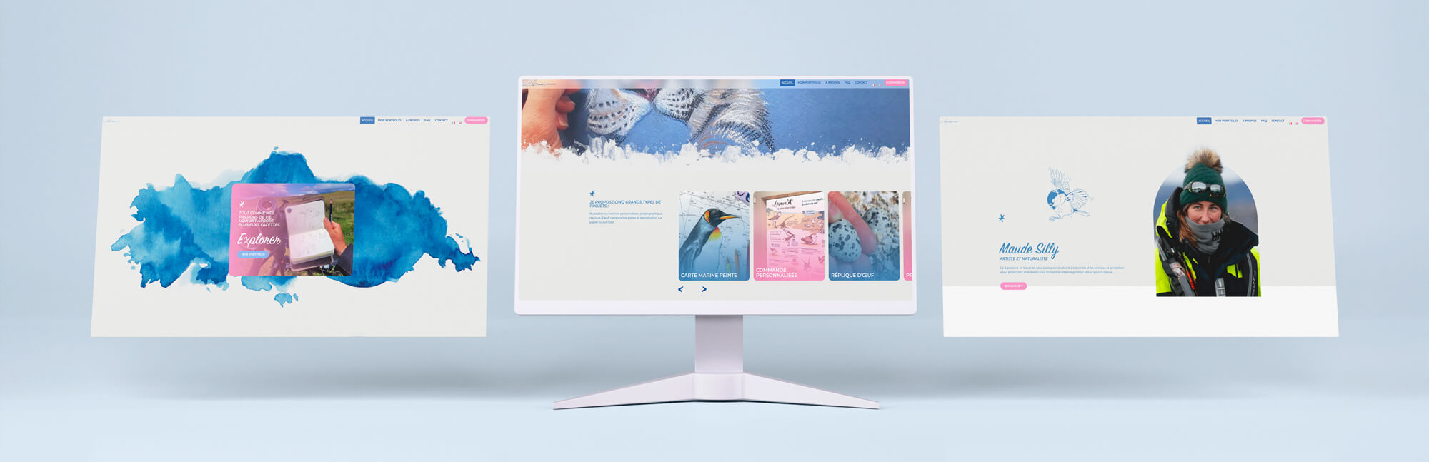 Moi, sur l’identité graphique du site, veillant scrupuleusement à mettre en valeur les réalisations de Maude. Ça passait par un fond clair similaire au papier qu’elle utilise pour ses aquarelles.