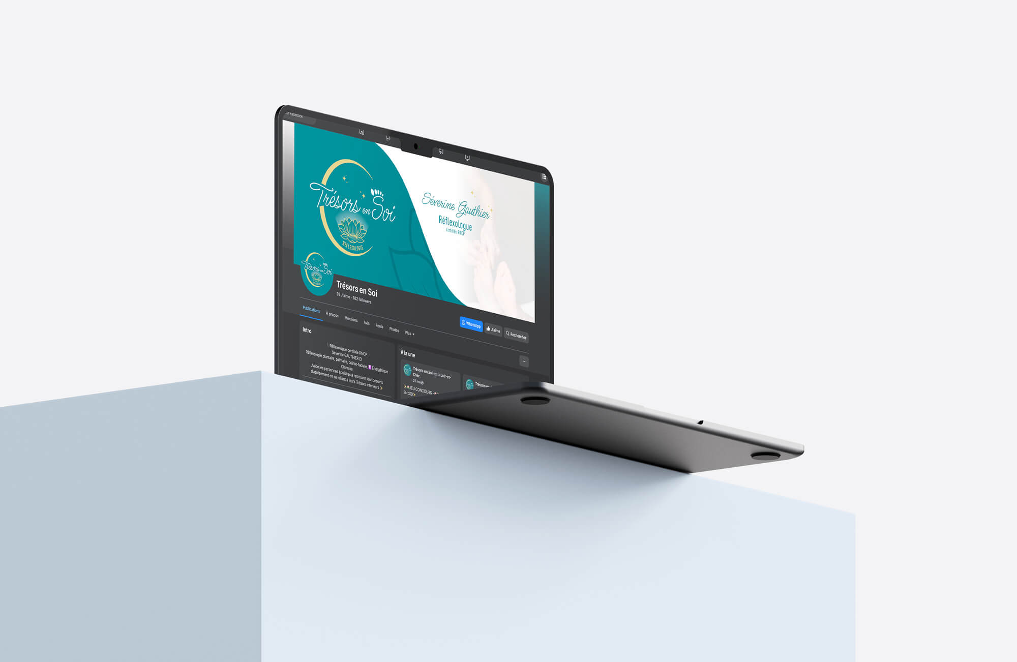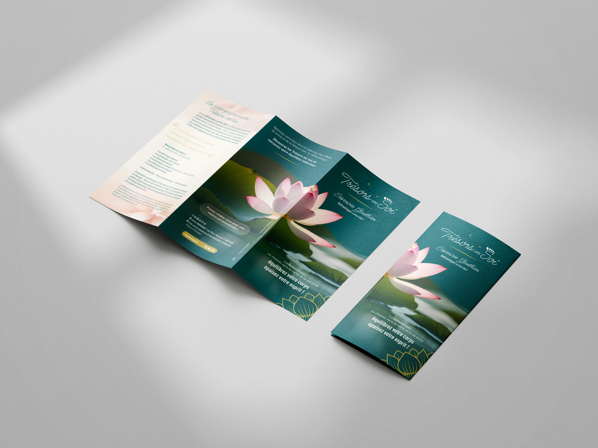 L’idée était de refléter un univers apaisant, inspiré par la nature et la douceur. Cette nouvelle identité graphique s’est déclinée sur un dépliant trois volets, qui présente toute la diversité de son activité, ainsi que des bannières pour les réseaux sociaux. 🪷